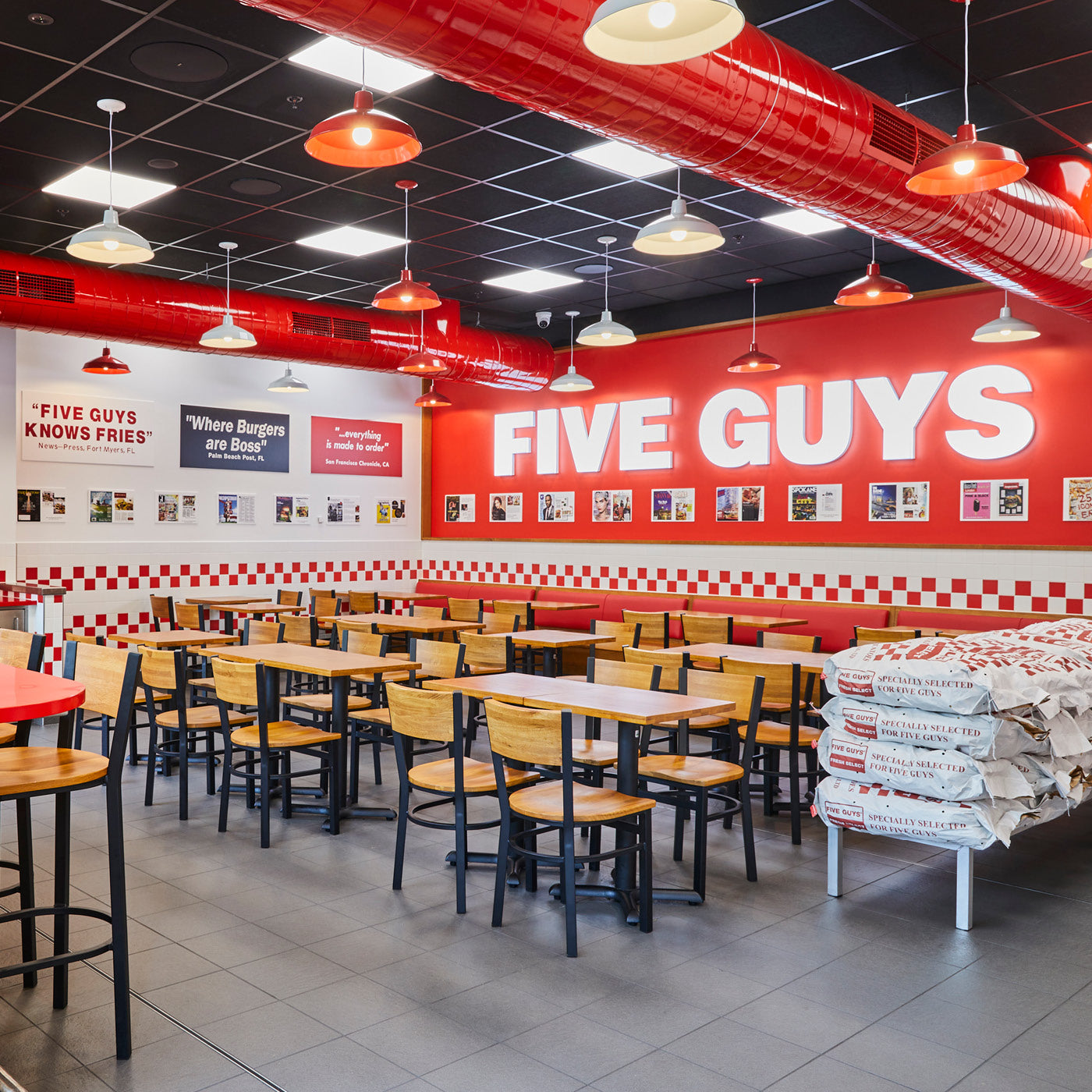 Bright, industrial-style pendants paired with crisp ambient lighting create a welcoming yet dynamic space, staying true to Five Guys' signature red-and-white aesthetic. By balancing functional illumination with statement fixtures, our lighting enhances the vibrant, fast-casual dining experience while maintaining the brand’s unmistakable identity.
