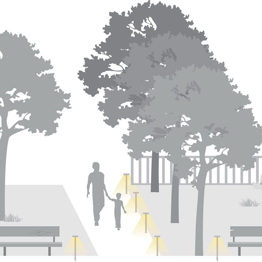 Plin Round is available in four finishes – cor-ten, white, grey and anthracite – and three variants: Plin 4, with angled head and diffuse optics; Plin 5, with perpendicular head and asymmetrical optics; and Plin 6, with asymmetric circular optics for all-round lighting. All three variants are available in 4000K, 3000K and 2700K colour temperatures, while Plin 6 also comes in a 2200K warm white light, the colour temperature recommended for protecting biodiversity.