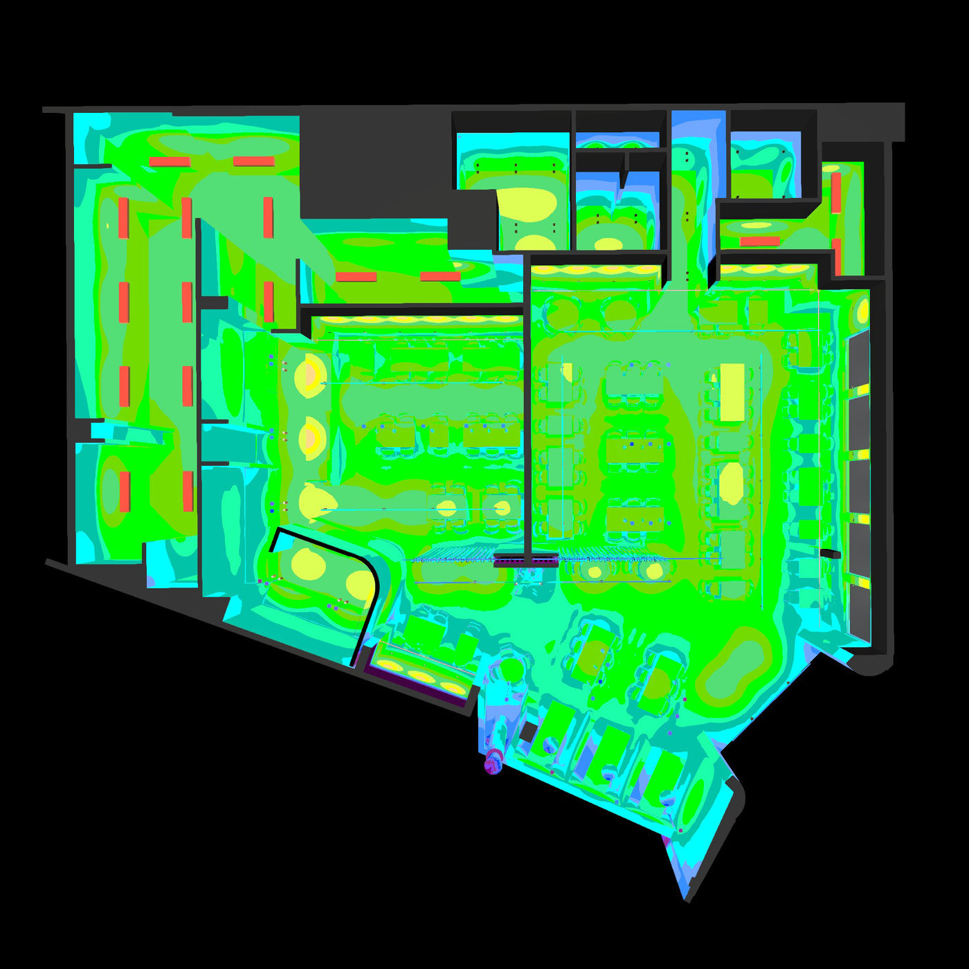Using advanced lighting design software, we generate heatmaps that visually represent lux levels to illustrate how light is distributed across a space. These maps ensure optimal light placement and allow us to fine-tune lighting for functionality, aesthetics, and energy efficiency. By analysing a heatmap, we can confidently create a well-lit environment that enhances customer experience and brand impact.