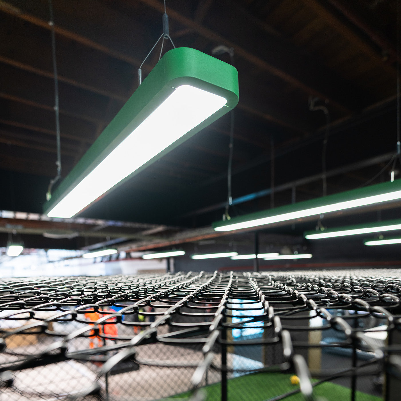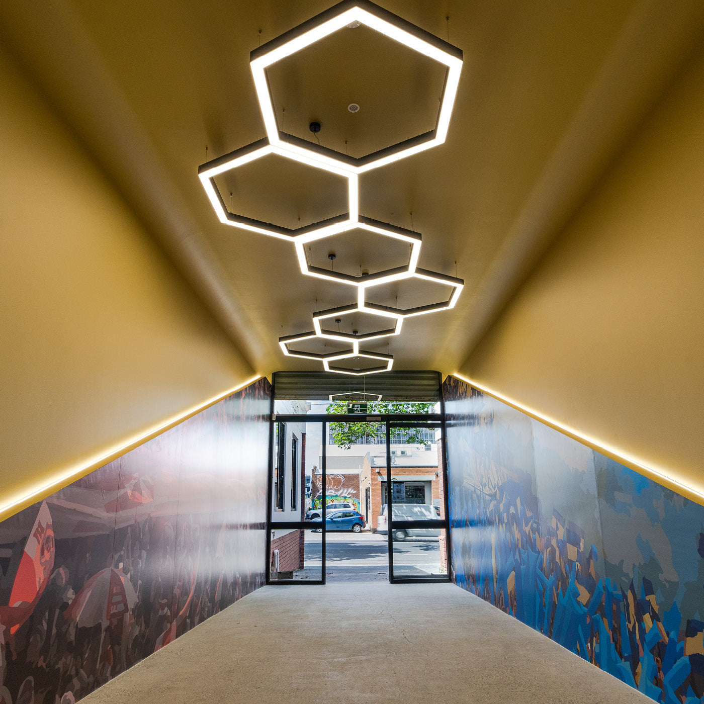 A standout feature of the design is the series of custom hexagon pendants used to create immediate impact in the entry corridor, guiding customers into the space with drama and intention. RGBW LED strips add vibrant highlights, while track lighting offers flexible functionality across the expansive floorplan.